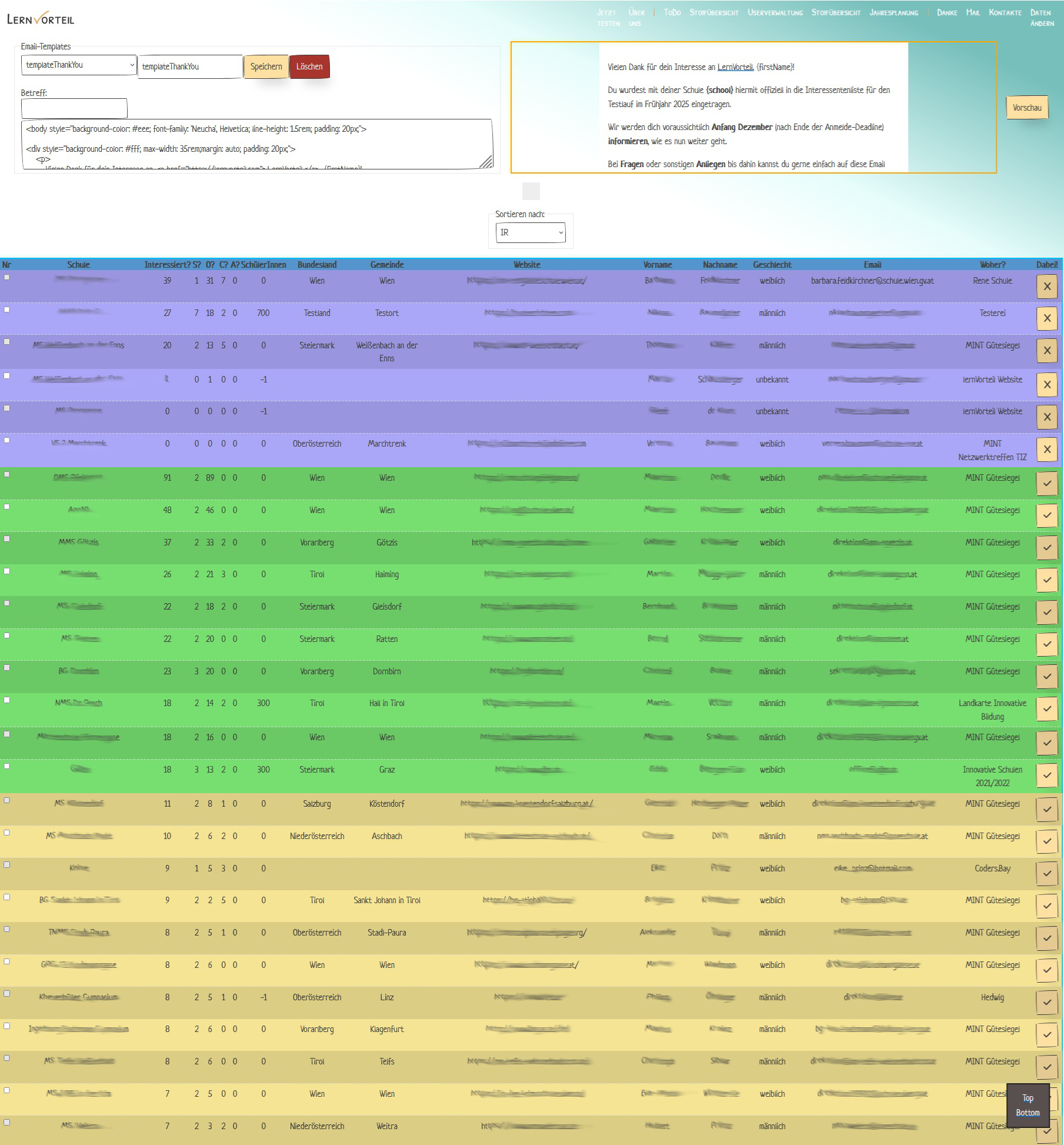 • Ergebnis: Trotz hohem initialem Interesse und Klicks meldeten sich von 160 kontaktierten Schulen nur 2 für den kostenlosen Testlauf an (1,25% Konversionsrate), obwohl bei der Vorauswahl der Schulen der Fokus auf innovative Schulen gelegt wurde, was eine Weiterführung des Projektes finanziell nicht sinnvoll erscheinen ließ.